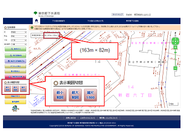 現在の台帳図の表示範囲は、画面左上に表示されています。 |